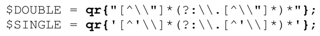 非常重要是,「$OTHER*」是加在每个匹配引用字符串的子表达式之后的,而之前的$OTHER(排在多选结构最前面的)必须用加号量词。如果你不清楚原因,请考虑下面的情况:添加的是$OTHER+,而某行中有两个连在一起的双引号字符串。同样,如果开头的$OTHER使用星号量词,则任何情况都能匹配。