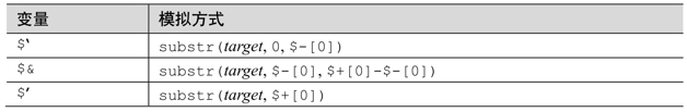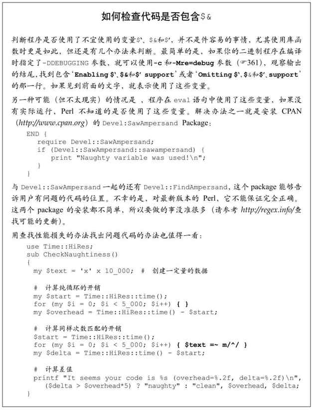 我还给出了$&的模拟。相对使用捕获型括号和$1的办法,这可能是一个更好的办法,这样完全不必使用任何捕获型括号。请记住,避免使用$&之类变量的目的就在于,如果表达式中没有出现捕获型括号,要避免保存原始副本。如果修改程序,去掉$&,再对每个匹配都增加捕获型括号,就不会节省任何时间。