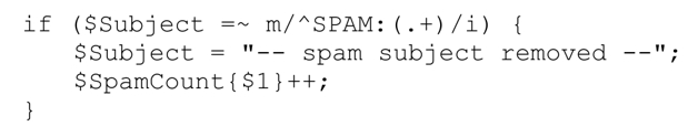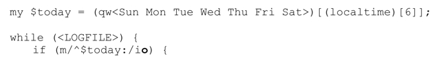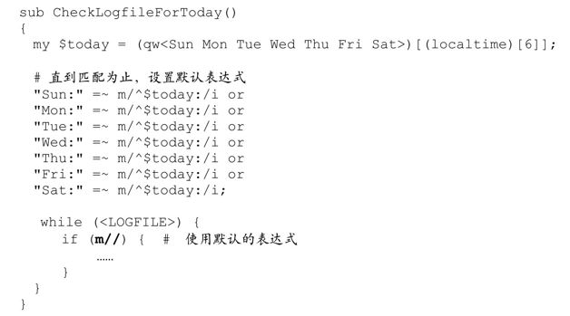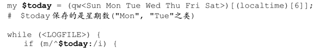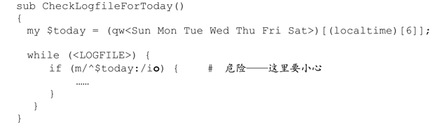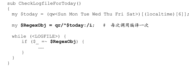 记住,/o表示正则运算元只需要编译一次。第一次调用CheckLogfileForToday()时,代表当天日期的正则运算元就锁定在其中。如果过了一段时间再次调用这个函数,即使$today变化了,也不会重新检查;在程序执行过程中,每次使用的都是最开始锁定在其中的正则表达式。