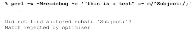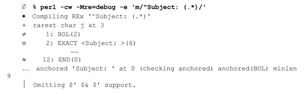 在∂处从shell提示符启动perl,使用命令行参数-c(意思是检查脚本,而不是确切执行它),-w(如果Perl对代码存有疑问,就会发出警报),以及-Mre=debug启用调试。-e表示下面的参数‘m/^Subject:·(.*)/’是一段Perl代码,需要运行或者检查。