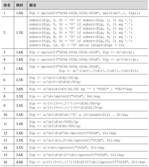 那么效率呢?为什么不同的解法有不同的效率?原因在于NFA的工作原理(第4章),Perl的各种正则优化措施(第 6 章),以及其他 Perl 结构的处理速度(例如 sprintf,以及substitution运算符的机制)。substitution运算符的/e修饰符,有时候虽然不可或缺,但效率低的解法似乎都使用了它。