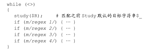 study一个字符串时,Perl会分配时间和内存来记录字符串中的一系列位置(在大多数系统中,需要的内存是字符串大小的4倍)。在字符串修改之前,针对此字符串的每次匹配都可以从中受益。对字符串的任何修改都会导致study数据的失效,相当于study另一个字符串。