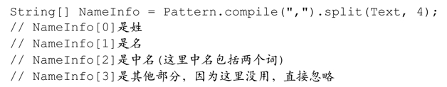 String result=Pattern.compile("\\s*,\\s*").split(",one,two,,,3");按照两边可能出现空白字符的逗号来分割,返回一个 5 个元素的数组:空字符串、‘one’、‘two’、两个空字符串和‘3’。