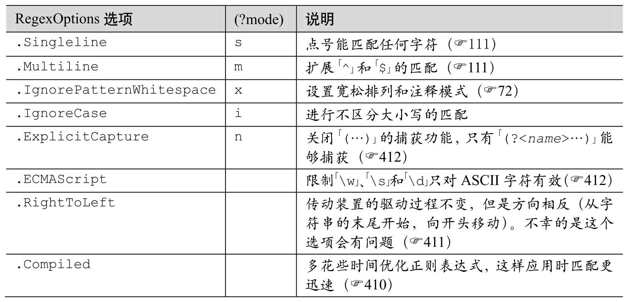 在接收正则表达式的函数和结构中设置标志位(flag),或是在正则表达式之内使用「(?modes-modes)」和「(?mods-mods:…)」结构,可以使用不同的匹配模式,流派的许多方面也会因此发生变化(☞110)。408页的表9-2列出了这些模式。