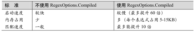 在程序第一次遇到正则表达式时进行初始的正则表达式解析(默认情况,即不用RegexOp-tions.Compiled)相对来说是很快的。即使在我这台有年头的550MHz NT的机器上,每秒钟也能进行大约1 500次复杂编译。如果使用RegexOptions.Compiled,则速度下降到每秒25次,每个正则表达式需要多占用大约10KB内存。