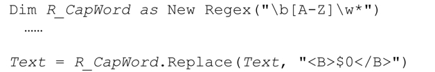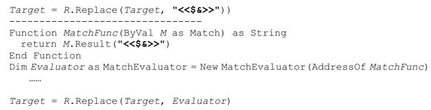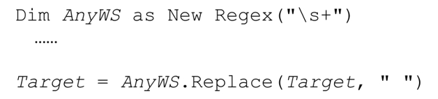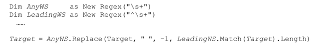 它会把‘····some···random·····spacing’转化为‘····some·random·spacing’,在查找和替换时,它使用LeadingWS匹配文本的长度作为偏移值(就是要跳过的字符数目)。这里用到了Match对象的简便特性,即LeadingWS.Match(Target)的Length属性(即便失败也没问题,此时Length的值为0,也就是说我们需要对整个目标字符串应用AnyWS)。