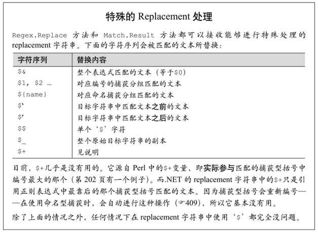 Replace方法会在目标字符串中进行查找-替换,返回(有可能已经变化的)字符串副本。它应用的是Regex对象的正则表达式,返回的不是Match对象,而是替换的结果。匹配的文本被什么内容替换,取决于replacement参数。replacement参数可以重载:它可以是一个字符串,也可以是MatchEvaluator委托(delegate)。如果replacement是一个字符串,它会按照下一页补充内容的说明进行处理。例如: