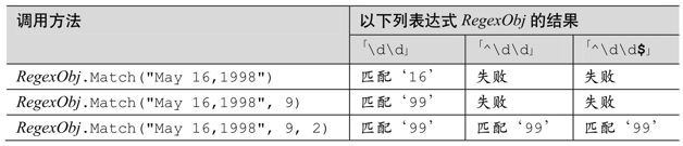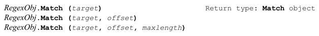 Match方法把正则表达式应用到目标字符串中,返回一个Match对象。通过这个Match对象可以查询匹配结果的信息(是否匹配成功,捕获的文本等等),初始化此正则表达式的“下一次”匹配。Match对象的细节见第427页。