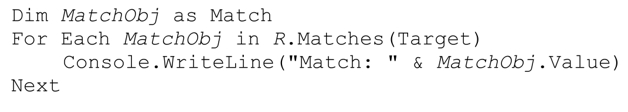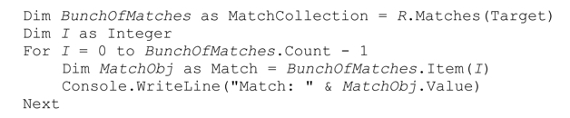 下面的程序输出同样的结果,它说明,MatchCollection 对象可以一次分配整个 Match-Collection。