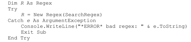 如果正则表达式包含了元字符的非法组合,就会抛出ArgumentException。通常,如果用户知道所使用的正则表达式能够正常工作,就不需要捕获这个异常,不过如果使用程序“之外”(例如由用户输入,或者从配置文件读入)的正则表达式,就必须捕获这个异常。