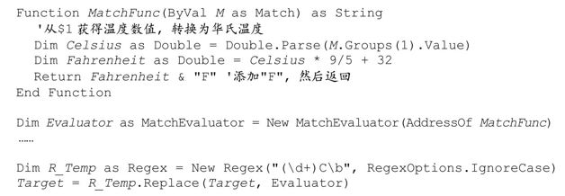 两段程序都用<<…>>标注匹配的文本。使用委托的好处在于,在计算replacement时我们可以进行任意复杂的操作。下面的例子把摄氏温度转换为华氏温度: