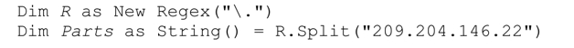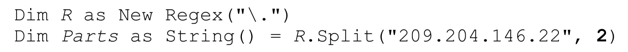 R.Split返回包含四个字符串的数组(‘209’、‘204’、‘146’和‘22’),它们由「.」在目标字符串中的三次匹配来分隔。