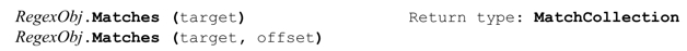 Matches方法类似Match方法,只是Matches方法返回一组Match对象,代表目标字符串中的所有匹配结果,而不是第一次的匹配结果。返回的对象为MatchCollection。