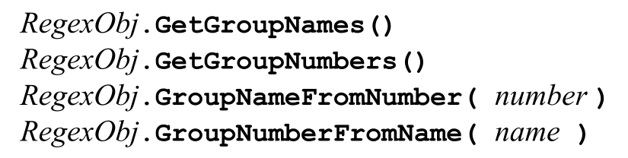 这几个方法容许用户查询对应编号(可以用数字,如果是命名捕获,也可以用名字)的捕获型分组的信息。它们引用的不是特定的匹配内容,只是正则表达式中存在的分组的名字和编号。下面的补充内容说明了使用方法。