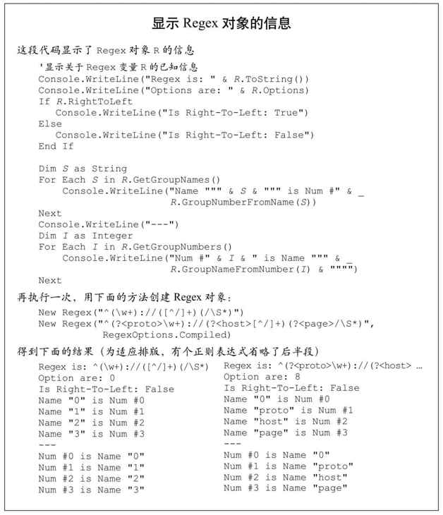 此属性是一个GroupCollection对象,其中封装了多个Group对象。它是一个普通的集合类(collection),包含了Count和Item属性,但是最常用的办法还是按照索引值访问,取出对应的Group对象。例如,M.Groups(3)对应第3组捕获型括号,M.Groups("HostName")对应命名捕获“HostName”(正则表达式中的「(?<HostName>…)」)。