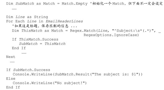 如果字符串数组EmailHeaderLines没有任何行(或者没有Subject行),程序中的循环就不会设置 SubMatch,如果 SubMatch没有初始化,循环之后检查 SubMatch会得到一个空引用异常。这种情况下用Match.Empty来初始化就很方便。