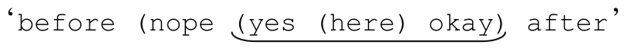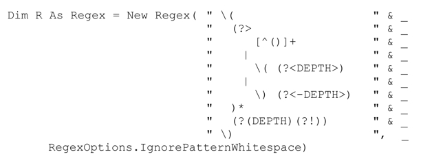 因此,当前已经成功匹配的‘DEPTH’分组总数就保存在回溯堆栈中。我们希望在找到闭括号之后减去它们。.NET独有的「(?<-DEPTH>)」结构,会从堆栈中去掉最近的“successful DEPTH”标记。如果不存在这样的标记,「(?<-DEPTH>)」就会报告失败,整个正则表达式的匹配宣告失败。