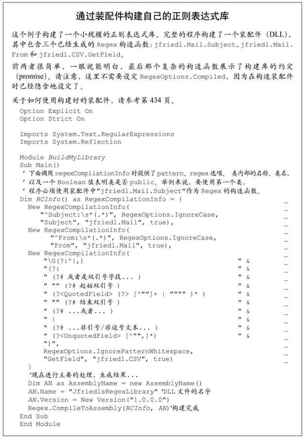 .NET能够把Regex对象封装到装配件(assembly)中,在构建正则表达式库时这很有用。下一页的补充内容提供了示例。