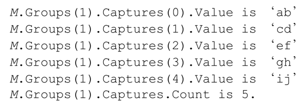 ●M.Groups(1).Capture 是一个 CaptureCollection,与普通的集合类(collection)一样,它包含了Items和Count属性。不过,通常大家都不会使用这两个属性,而是通过索引值直接访问,例如 M.Groups(1).Captures(3)(在 C#中是 M.Groups[1].Captures[3])。