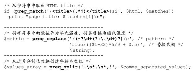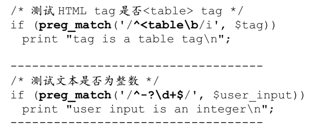 因为正则表达式很有可能包含反斜线,,所以在以字符串文字方式提供pattern参数时,最好使用PHP的单引号字符串。第3章介绍了PHP的字符串文字(☞103),简单地说,如果使用单引号字符串文本,正则表达式就可以省略许多额外的转义。PHP 的单引号字符串只有两个元序列,‘’’和‘\\’,分别代表单引号和反斜线。