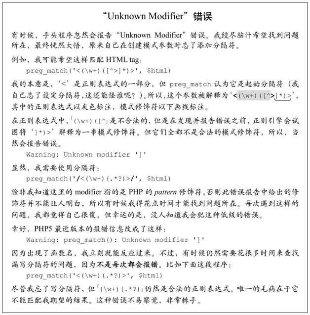 preg引擎要求正则表达式两端必须有分隔符,因为设计者希望它看起来更像Perl,尤其在模式修饰符的使用方法上更是如此。有的程序员觉得在正则表达式两端添加分隔符简直是多此一举,但是无论好还是不好,规定就是规定(第448也给出了一个“不好”的原因)。
