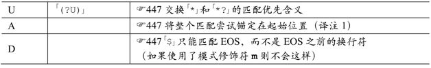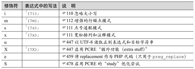 PHP特有的修饰符 列表最上端的4个模式修饰符属于标准修饰符,在第3章(☞110)已经讨论过。修饰符e只能在preg_replace中使用,详细的讨论见对应的小节(☞459)。