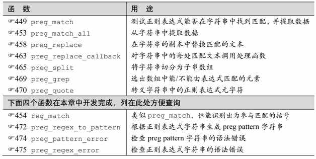 PHP正则引擎的处理方式完全是程序式的(☞95),包括表10-2顶端的6个函数,表格还列举了4个有用的函数,将在本章后面提到。
