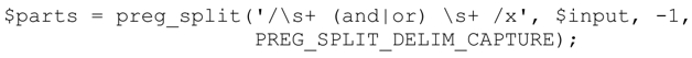 $parts=preg_split('/\s+(and|or)\s+/x',$input);