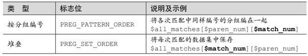 默认情况下,$all_matches是按分组编号的,但我们可设置PREG_SET_ORDER来改变它。PREG_SET_ORDER 排列方式 如果设定了 PREG_SET_ORDER 标志位,就会采用“堆叠(stacked)”的排列方式。它会把第 1 次匹配的所有数据保存在$all_matches[0] 中,第 2次匹配的所有数据保存在$all_matches[1] 中,依次类推。这就是我们检索字符串的顺序,把每次成功匹配的$matches放进$all_matches数组中。