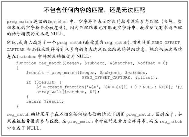 如果一组捕获型括号没有参与最终匹配,它会在对应的$matches中生成一个空字符串(注2)。需要说明的是,$matches末尾的空字符串都会被忽略。在前面那段程序中,如果「(\d+)」参与了匹配,$matches[3]会保存一个数值,否则,$matches[3]根本就不会存在。