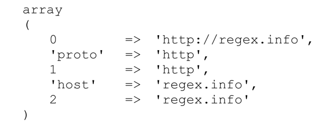 如果使用了命名捕获,按数字编号的捕获仍然会插入$matches。例如,在匹配$url(值为‘http://regex.info’)之后,之前例子中的$UrlInfo包含: