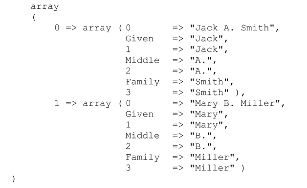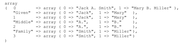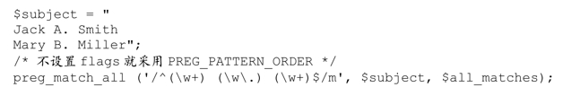 默认的排列方式是 PREG_PATTERN_ORDER 下面有个例子(我称其为“按分组编号的(collated)”——稍后将介绍)。如果没有设置标志位,这就是默认的配列方式:
