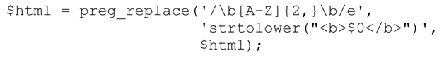 如果使用了模式修饰符e(它只能出现在preg_replace中),replacement字符串会作为PHP代码,每次匹配时执行,结果作为replacement字符串。下面这个扩展的例子把bold tag里的单词变为小写:
