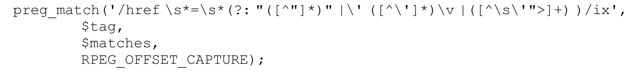 来看个从tag中提取HREF属性的例子。HTML的属性值两边可能是双引号、单引号,或者干脆没有引号,这样的值在下面这个正则表达式的第1组、第2组和第3组捕获型括号中被捕获: