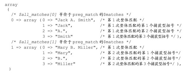 如果使用了命名分组,$all_matches将会多出命名元素(同preg_match一样☞451)。这段程序: