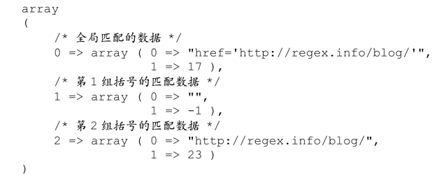 $matches[0][0]包含正则表达式匹配的所有文本,$matches[0][1]表示匹配文本在目标字符串中的偏移值,按字节计数。