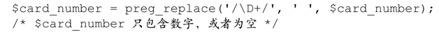 其中用 preg_replace 来去掉非数字字符。更确切的说,它用 preg_replace 来生成$card_number 的副本,将其中的非数字字符替换为空(空字符串),把这个经过修改的副本赋值给$card_number。