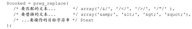 如果要在正则表达式中以文字方式使用某个字符串,可以用内建的preg_quote函数来转义其中可能产生的正则表达式元字符。如果指定了创建pattern时使用的分隔符,字符串中的分隔符也会被转义。