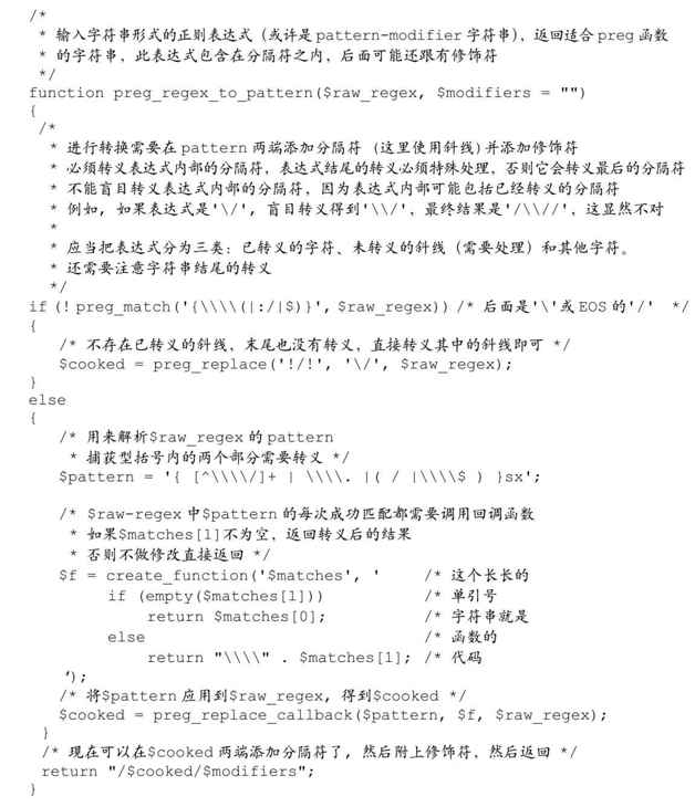 下面的函数接收正则表达式字符串,以及可能出现的 pattern-modifier 字符串,返回一个可以用于preg函数的pattern字符串。代码中难看的反斜线(正则表达式和PHP子串转义)或许是你见过的最复杂的表示;这段代码并不容易读懂(如果你希望补习PHP单引号字符串的语意,请参考第444页)。