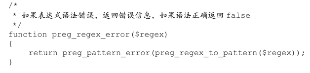 这个函数使用刚刚开发的功能来检查一个纯正则表达式(没有分隔符也没有模式修饰符)的语法。如果语法不正确,会返回对应的错误信息,如果语法正确,返回false。