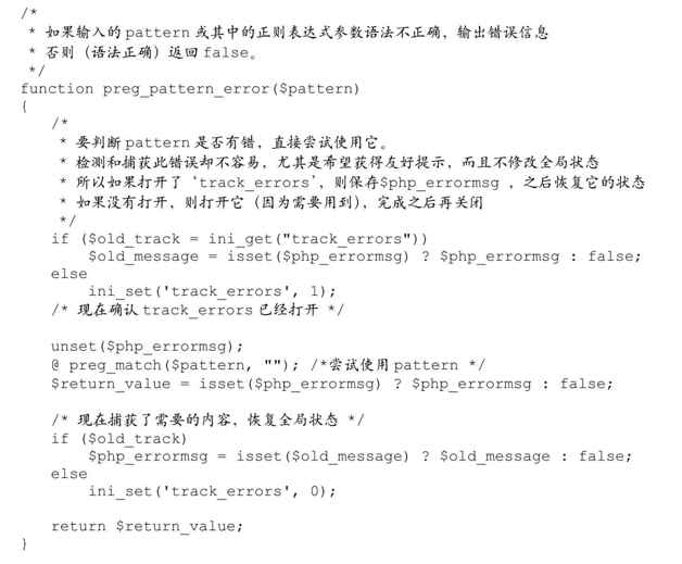 preg_pattern_error会对pattern 参数进行简单测试,试图使用此正则表达式——在函数当中有一行调用preg_match。函数的其他部分使用关注PHP的管理功能处理preg_match可能显示的错误信息。
