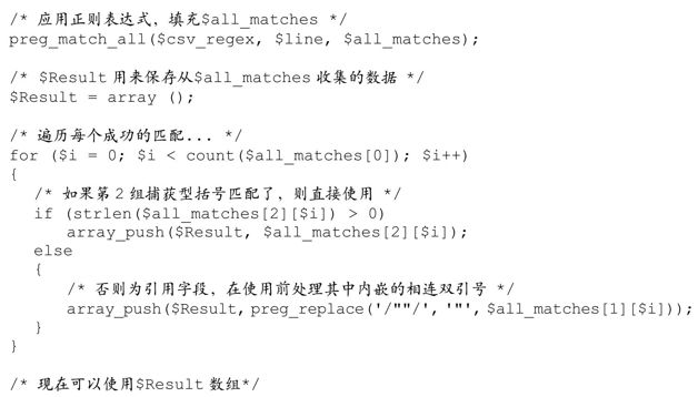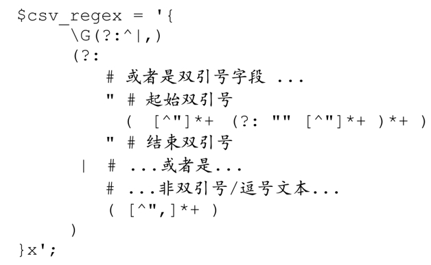 这里有一个用PHP解析CSV(逗号分隔值)的程序,原来的例子在第6章(☞271)。这个正则表达式使用了占有优先量词(☞142),而不是固化分组括号,因为它们看起来更清晰。首先,这是我们将要使用的正则表达式:
