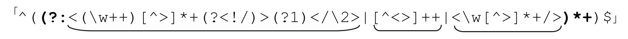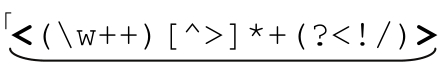 关于第1个多选分支「<(w++)[^>]*+(?<!/)>」中的「w++」的占有优先,我希望多说几句。如果流派的功能不够强大,不能使用占有优先量词或者固化分组(☞139),我会在这个多选分支的(w+)之后加上b:「<(w+)b[^>]*(?<!/)>」。