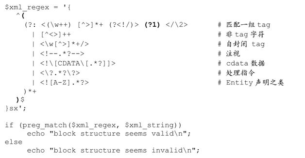 真实世界的XML比简单的匹配tag要复杂得多。我们还必须考虑XML注释、CDATA部分、处理指令和其他。