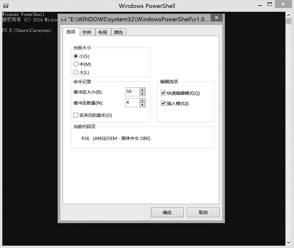 在【字体】标签页,选择稍微大于默认12像素的字体。不管你是否拥有1.5的视力,稍微提高一下字体大小也没什么坏处。PowerShell希望你能在大量类似的字符中快速区分它们,比如’(撇号或单引号)和`(重音符)。如果使用小像素字体,识别这类字符将比较困难。