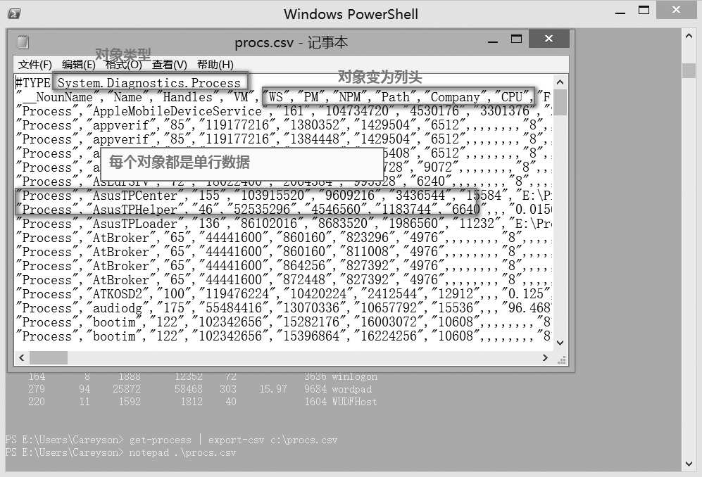 类似于用管道把“Dir”连接到“More”,我们已经把进程信息传输到“Export-CSV”中。第二个Cmdlet有一个强制的位置参数,用于指定输出文件名。因为“Export-CSV”是一个内置的PowerShell Cmdlet,它知道如何把通过“Get-Process”产生的常规表格转换到一个普通的CSV文件中。