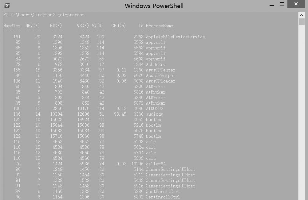当运行“Get-Process”时,屏幕会显示出图6.1的结果。