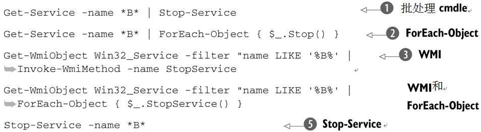 。这里,我们使用Get-Service获取所有名称包含“B”的服务,并停止这些服务。 - 第二种方式类似。但使用ForEach-Object来替代批处理Cmdlet,并要求每个服务执行Stop方法