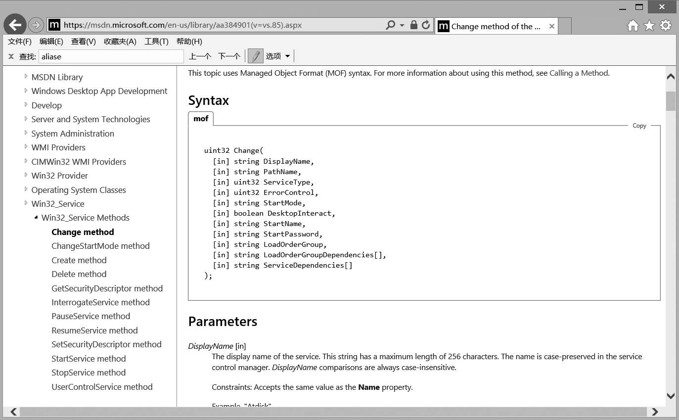 我们使用Win32_Service这个WMI类作为示例。更详细地说,我们将使用Change方法。这是一个可以一次性变更某个服务中多个元素的复杂方法。图16.2展示了其在线文档(我们通过搜索“Win32_Service”找到该列面并导航的Change方法页)。