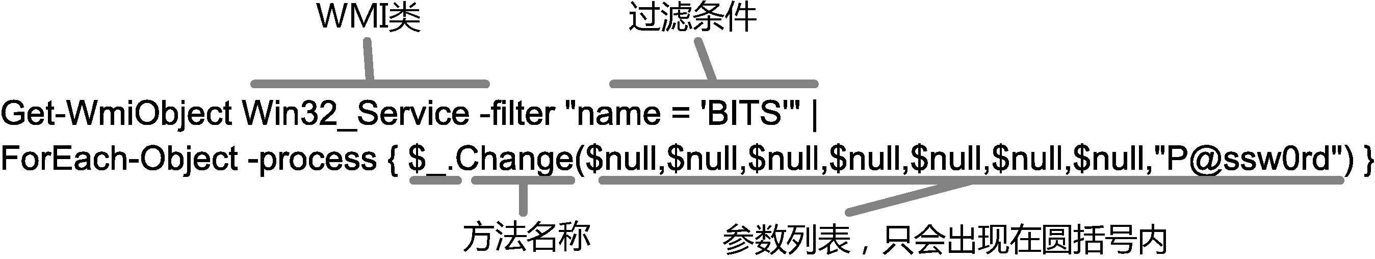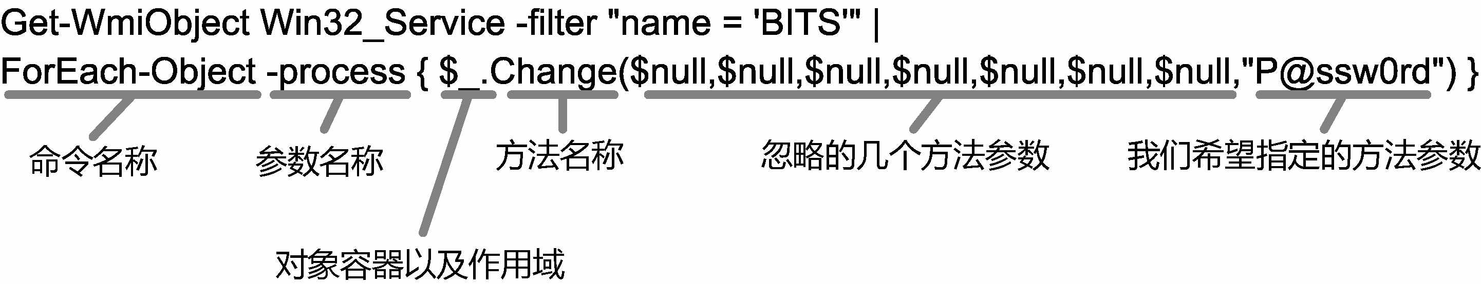 Get-WmiObject Win32_Service -filter "name = 'BITS'" | ➥ ForEach-Object -process { ➥ $_.change($null,$null,$null,$null,$null,$null,$null,"P@ssw0rd") ➥ }